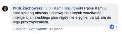 Niestety bardzo mnie Pani rozczarowała. Raz, że nie odpowiedziała Pani na moje pytanie, dwa, sposobem w jaki Pani w ogóle odpowiedziała. Ponadto ja nie pytałam o Pani sytuację osobistą, bo akurat to nie jest do niczego Iławie potrzebne.