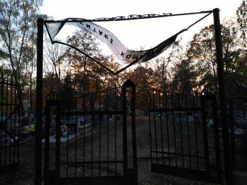 Zniszczony napis nad bramą wejściową na cmentarz przy Wyszyńskiego w Iławie koło białego kościoła. [...] Ludzie! Przecież to wstyd. |