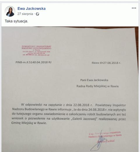 Dziś na otwarciu Centrum Aktywności Lokalnej przy Jasielskiej właśnie ta sama [...] Ewunia Jackowska zajęła czołowe miejsce w pierwszym rzędzie pomiędzy pierwszymi w Iławie. [...] Przyzwoitości i pokory to ty kobito nie masz za grosz nawet. [...]