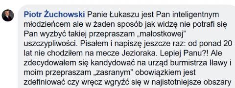 "Od ponad 20 lat nie chodziłem na mecze Jezioraka. Lepiej Panu?! Ale zdecydowałem się kandydować na urząd burmistrza Iławy i moim przepraszam "zasranym" obowiązkiem jest zdefiniować czy wręcz wgryźć się w najistotniejsze obszary życia miasta."
