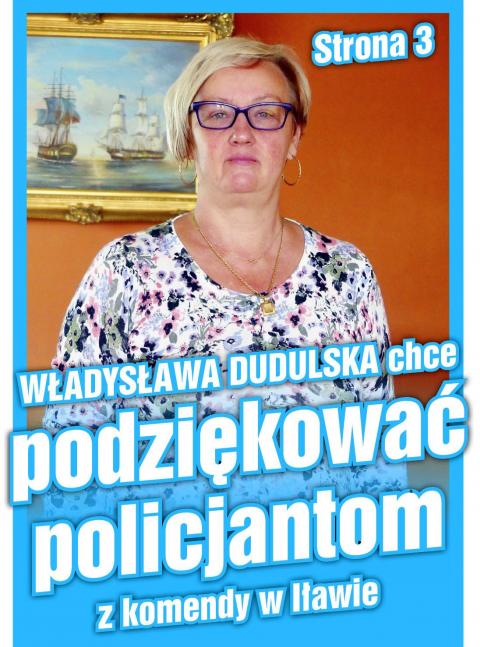 Władysława Dudulska pragnie podziękować policjantom z komendy w Iławie. Choć nie musieli, ale bardzo pomogli kobiecie w stresującej dla niej i nietypowej sytuacji. O co chodziło? Czytajcie w bieżącym wydaniu tygodnika „Kurier Iławski” od środy. |
