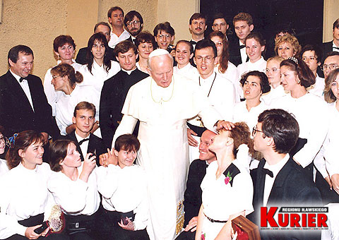 – To było na Przeglądzie Chórów Nauczycielskich – mówi Szymańska. – Potem wiele emocji przyniósł wspólny występ z innymi chórami podczas wizyty papieża Jana Pawła II w Olsztynie. W 1992 roku po raz pierwszy wyjechaliśmy za granicę – do Szwecji. Rok później udaliśmy się w podróż do Włoch – między innymi przygotowaliśmy oprawę muzyczną do mszy koncelebrowanej przez papieża w Castel Gandolfo.