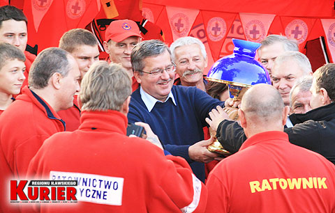 Prezydent spotkał się z ratownikami Wodnego Ochotniczego Pogotowia Ratunkowego. Obejrzał ich sprzęt i dostał od nich lampę w prezencie.